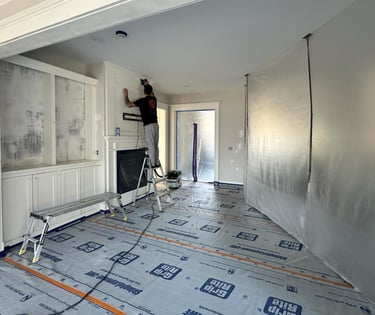 Furniture, floors, and non-painted areas. are covered and protected.